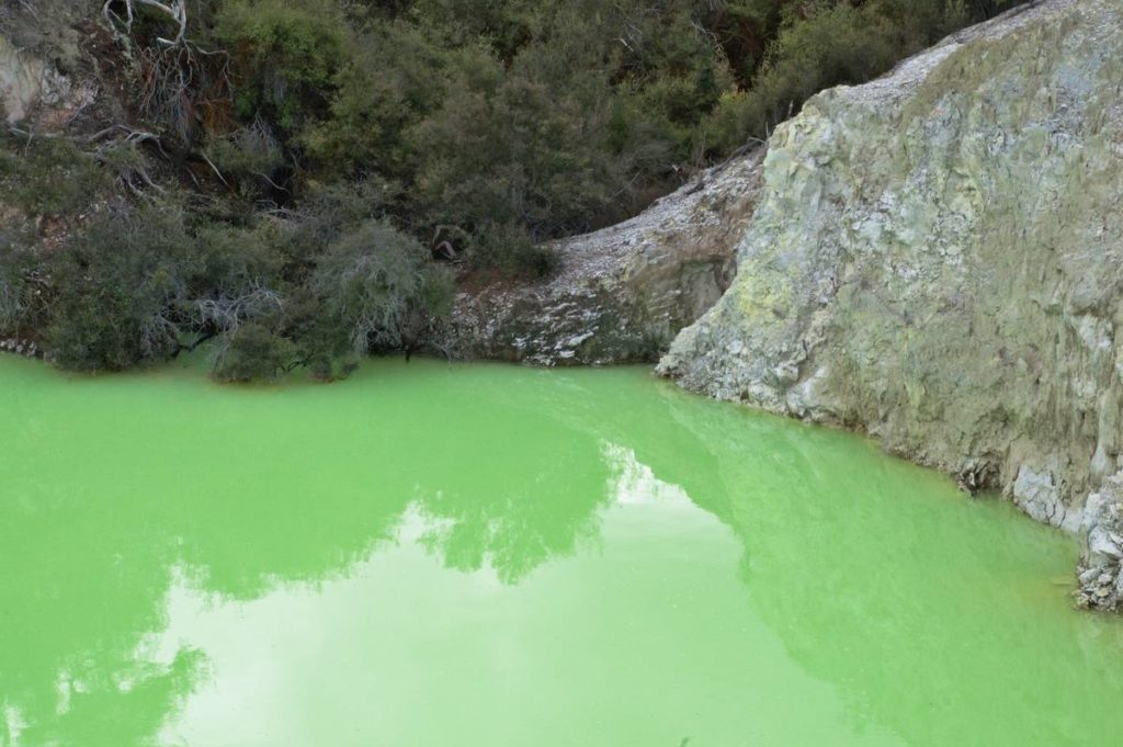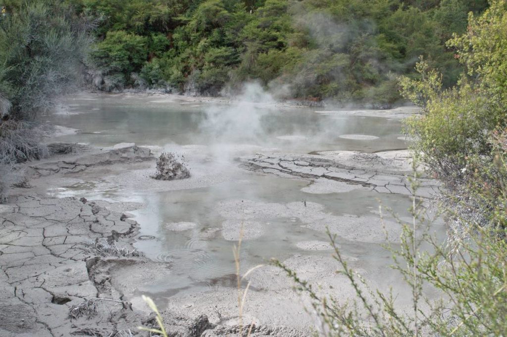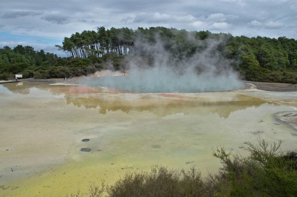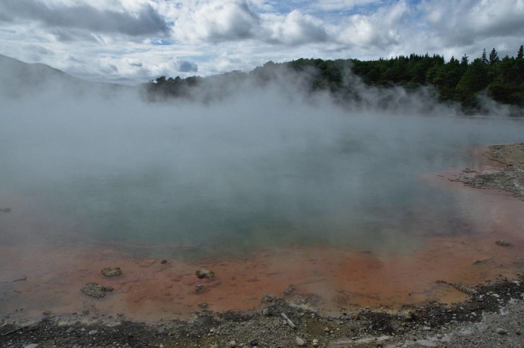 Un peu plus loin nous avons visité Wai-O-Tapu, un parc exceptionnel pour ses phénomènes géothermiques: concrétions de soufre, cratères fumants et rugissants, bassins effervescents, concrétions rouges, bassins de boue bouillonnante, lac vert fluorescent. De quoi tenir les sens en éveil. Les différentes couleurs sont dues aux ions métalliques qui précipitent au contact du dioxide de carbone, fer, argent, or, antimoine, mercure etc.