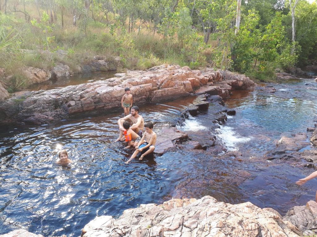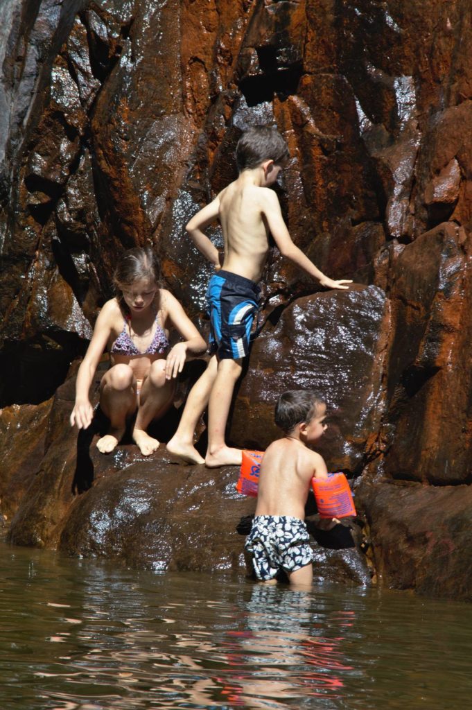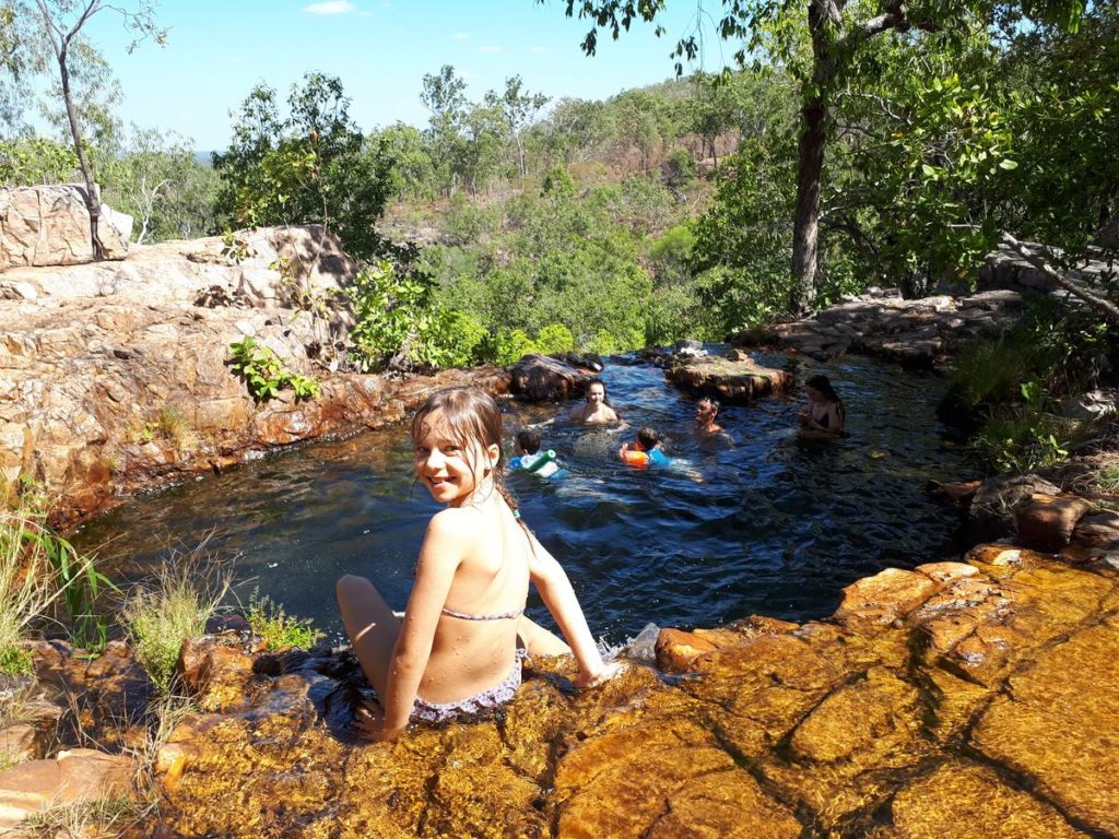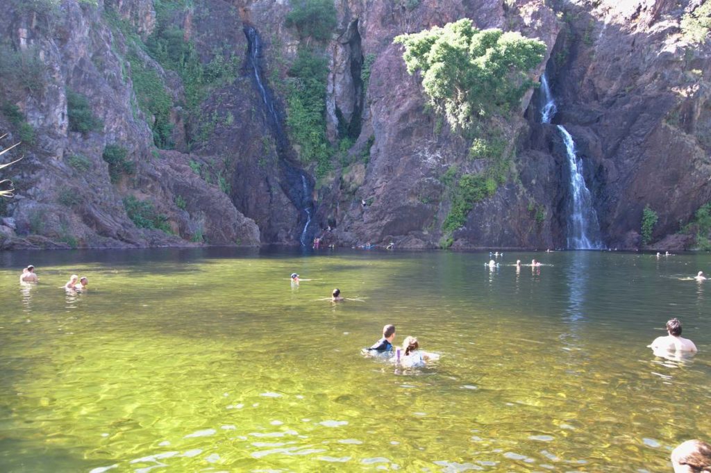 Nous l’avons dit, on ne peut généralement pas se baigner dans les rivières à cause des crocodiles, qui malgré toutes les précautions et la signalisation tuent régulièrement des personnes. Malgré-cela il y a de nombreux endroits où se baigner, soit en amont de cascades, soit dans des endroits où les crocodiles sont « gérés ». Nous avons eu la chance de nous baigner dans des endroit magnifiques.