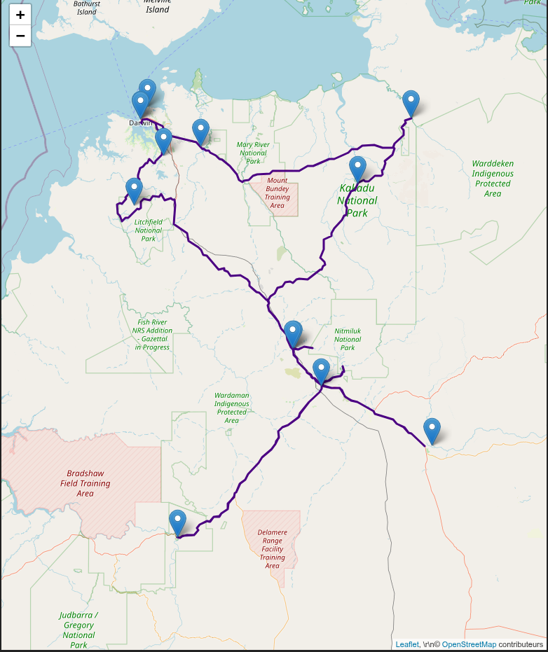 Nous avons fait un peu plus de 2000 km et sommes restés dans la région de Darwin. Les lieux principaux de notre périple ont été le parc national de Kakadu, celui de Nitmiluk, la ville de Katherine, Mataranka, la rivière Victoria et le parc de Litchfield.
