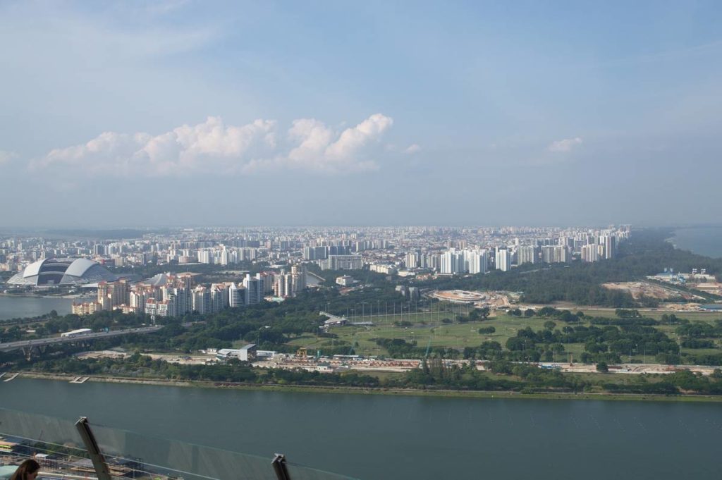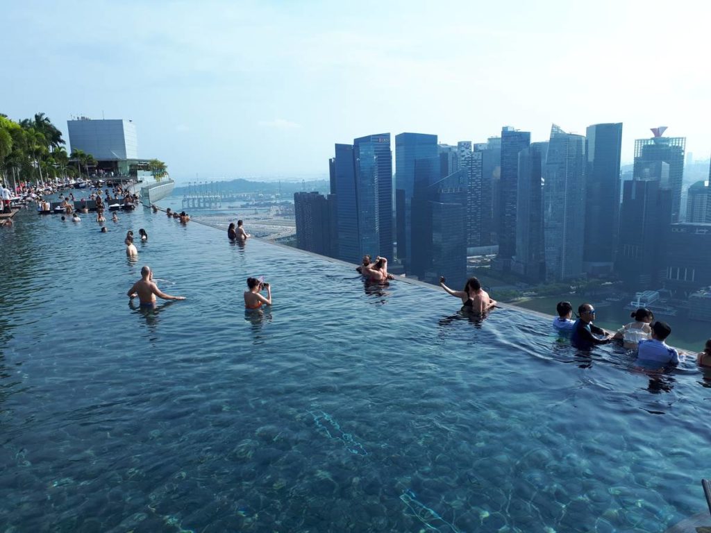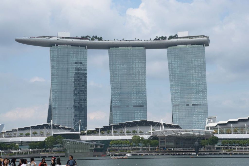 Marina Bay Sands: immense hôtel de luxe avec ses deux arches qui surplombent la ville et sa grande piscine à débordement sur le toit! Tout ce quartier était à l’origine sous l’eau. En effet Singapour qui ne cesse de grandir, a gagné de la superficie en rapportant de grandes quantités de sable et asséchant certaines parties… Ce n’est pas très écolo…
