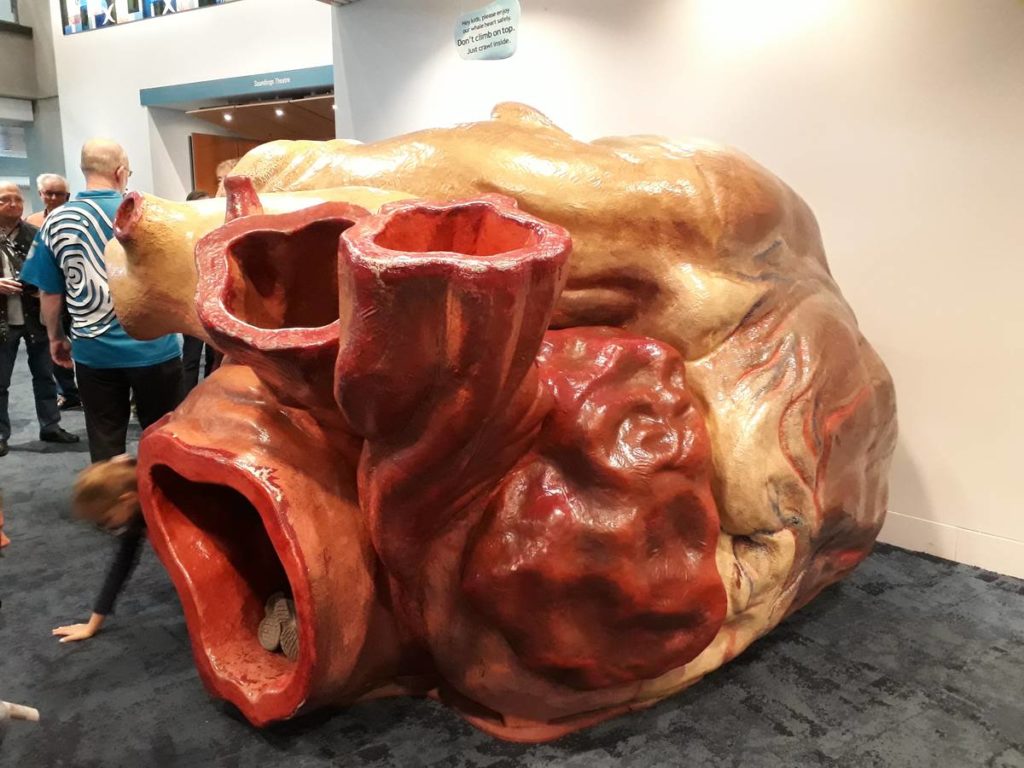 Le mardi matin nous avons visité le musée Te Papa. Il s’agit d’un très grand musée national, Te papa signifie « le lieu des trésors » en maori. Son bâtiment, imposant en bord de mer, comprend différents niveaux qui présentent la Nouvelle Zélande d’un point de vue géologique et géographique, puis historique et culturel. Nous nous sommes attardés dans le niveau expliquant l’histoire de la Nouvelle Zélande depuis l’arrivée des Maoris vers 1200 venant des îles lointaines du Pacifique par canots à voile et puis l’arrivée des premiers européens vers 1800. Nous avons également passé du temps au musée dans la partie consacrée aux trésors maoris. Nous avons pu admirer de superbes canots à voile, des sculptures maories en bois, des maisons dont le toit était fait en feuilles de palmier… et une copie d’un extrait du fameux traité de Waitangi signé entre les Maoris et la couronne britannique le 6 février 1840 et accordant aux deux partis une souveraineté partagée sur la Nouvelle Zélande en contrepartie de la protection par la couronne britannique vis à vis d’agresseurs extérieurs (comme les Français par exemple…). Ce traité fût signé à la fois en langue maorie et en langue anglaise, ce qui sur certains points laisse place à l’interprétation et à quelques controverses..