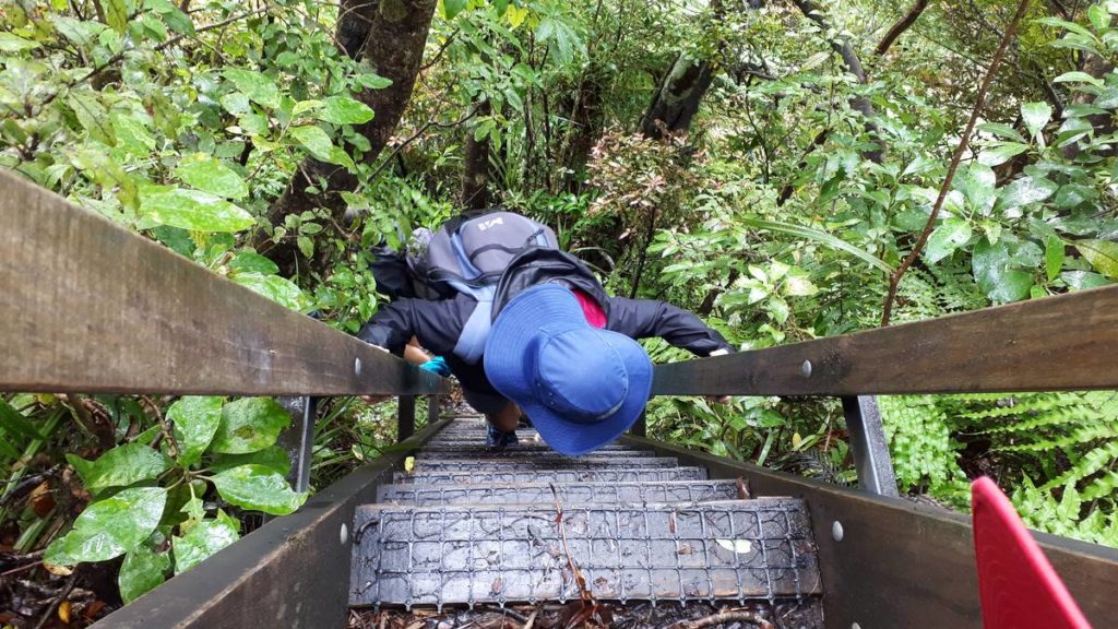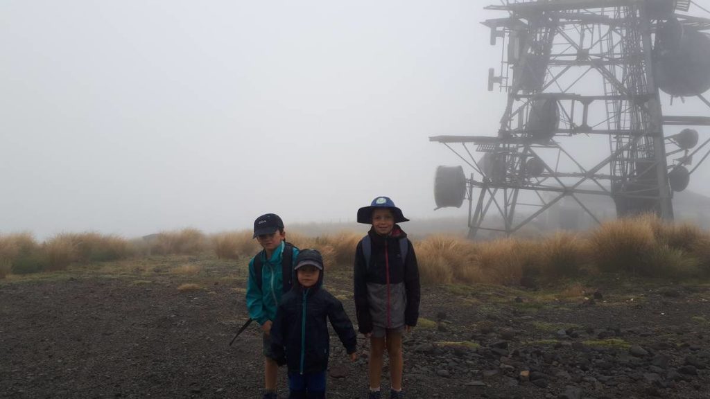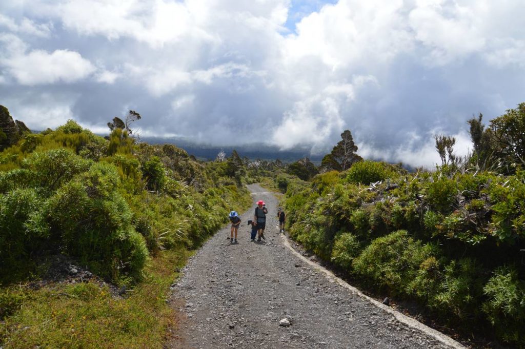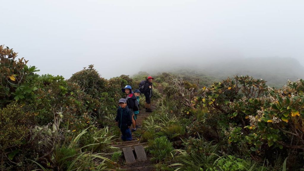 Le jeudi matin nous avons décidé de débuter l’ascension du volcan à pied depuis le parking Egmond Nord situé à environ 950 mètres d’altitude malgré le temps médiocre. Nous nous sommes élevés jusqu’à 1470m, près d’une antenne de télécommunication, puis sommes redescendus par un autre chemin sportif! Nous avons regretté de ne pas bénéficier de la vue sur la mer à cause des nuages puis de la pluie. Le retour a été plus long que prévu et la pluie nous a bien mouillés. Les enfants ont été endurants et courageux. Au menu: descente très raide, de nombreux escaliers avec de hautes marches, des racines, un terrain détrempé, le tout dans un cadre magnifique de forêts tropicales. Nous n’avons pas croisé grand monde!