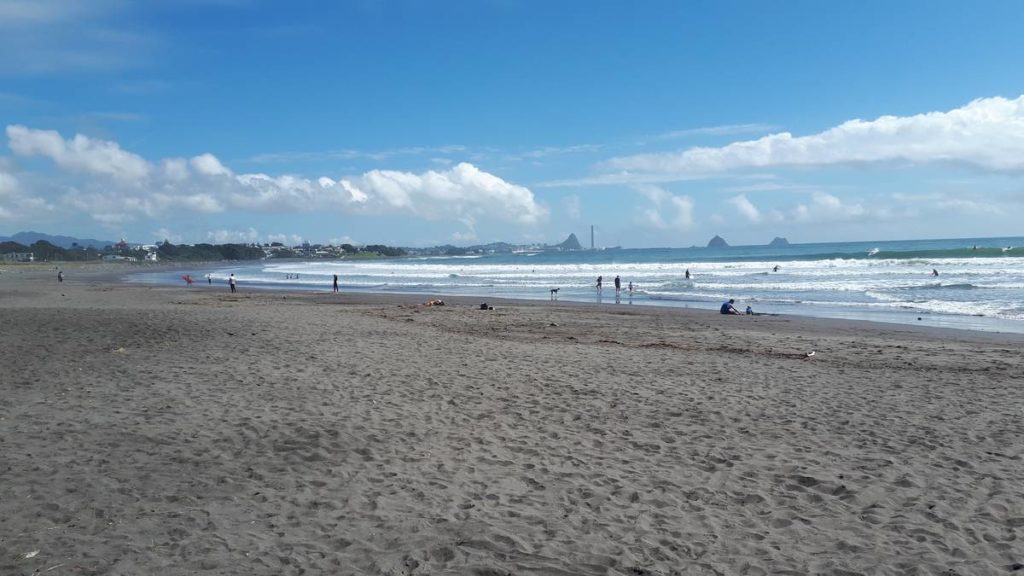 Dimanche 17, nous avons contourné la ville d’Auckland qui est entourée par la mer à l’Est et à l’Ouest. Nous avons eu un petit aperçu des quelques ralentissements dus aux retours de week-end des habitants d’Auckland ! De loin, nous avons vu la fameuse grande tour Sky Tower du centre ville tant attendue par les enfants qui l’avaient repérée dans les guides touristiques. Nous avons rejoint Muriwai Beach, situé à 40 minutes au nord-ouest d’Auckland sur la côte Ouest, où nous avons passé la nuit. Le lendemain matin nous avons profité de la belle plage de sable fin très appréciée des surfeurs et des baigneurs.