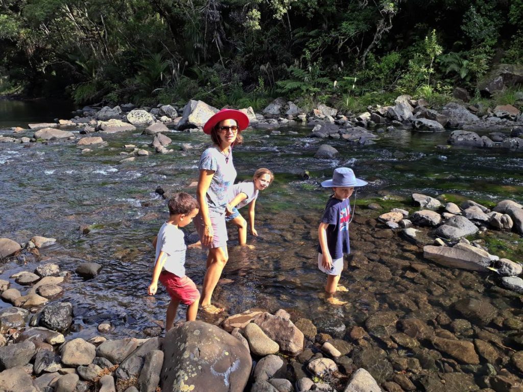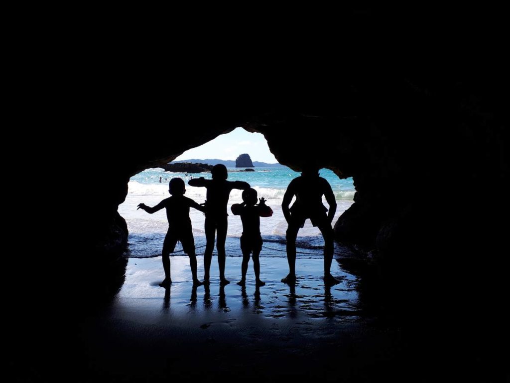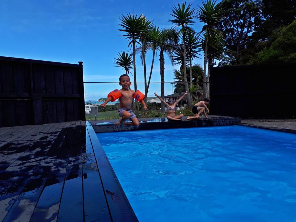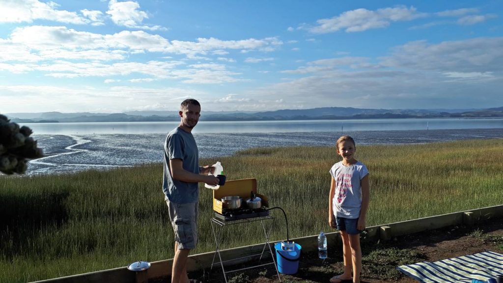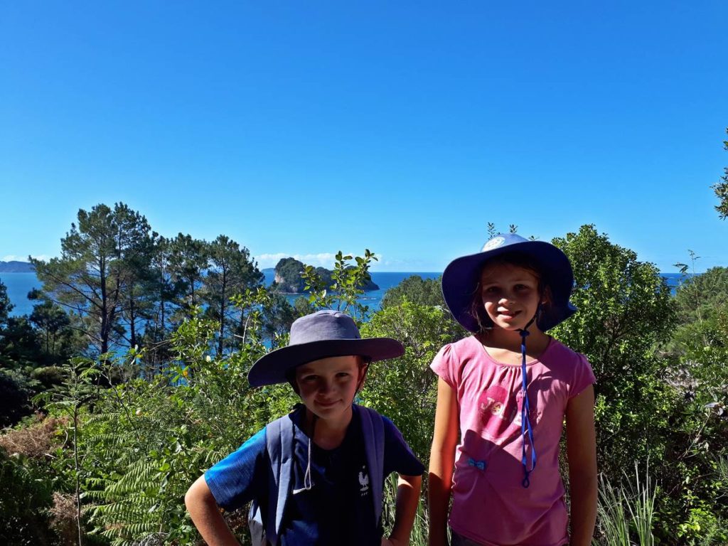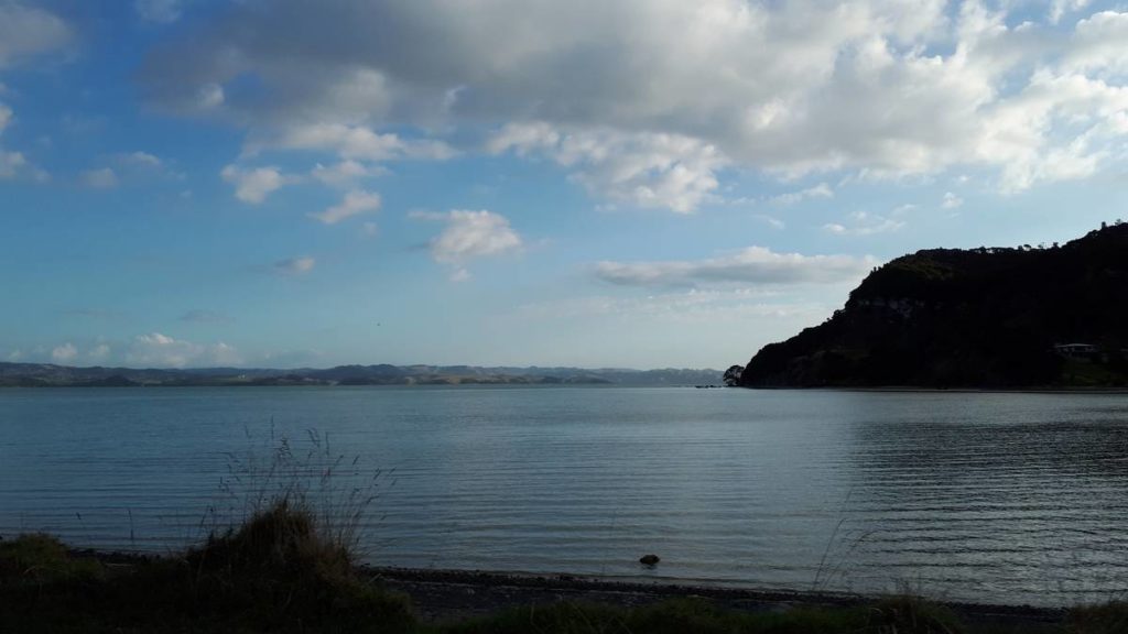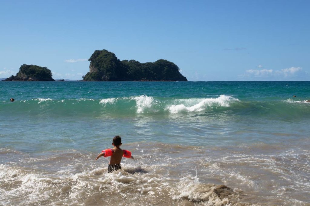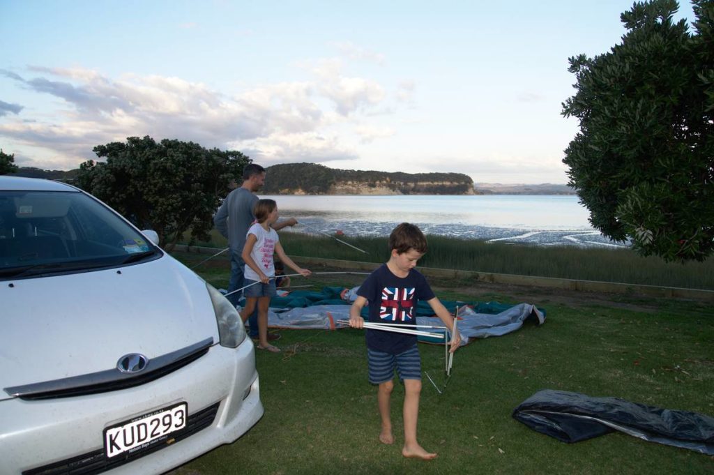 Le trajet entre Auckland et les Coromandel n’a pas été très long. Les lieux les plus touristiques se situent à l’est de la péninsule mais nous avons privilégié l’ouest, plus calme, pour notre hébergement. Nous avons trouvé un beau camping confortable à Amodeo Bay, face à la mer, où nous voulions nous poser pour trois nuits. C’est un gros avantage de voyager en fin de saison: on a beaucoup plus le choix et on peut se décider au dernier moment. Il y avait même une piscine que les enfants ont bien appréciée!