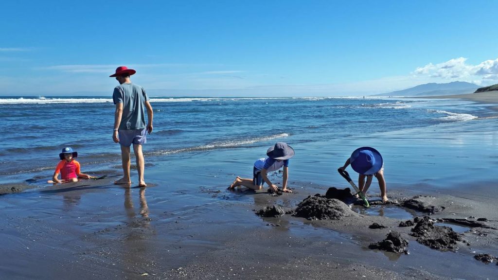 Le lendemain, c’était repos. Nous sommes quand même allés nous baigner à la plage la plus proche du camping et j’ai de nouveau essayé la pêche au paua (dont nous vous avions parlé dans notre article sur le Southland). Depuis l’île du Sud je m’étais équipé d’un masque, d’un tuba, d’un tournevis et d’une règle pour mesurer les éventuelles prises. J’avais fait quelques essais mais entre la marée, les vagues, les rochers, ce n’est pas évident de réunir toutes les bonnes conditions. Hélas, cette dernière tentative fut également décevante. Trop de vagues, peu de visibilité… Nous ne mangerons donc pas de pauas. Nous nous sommes rabattus sur des bulots et avons fait une bonne partie de pêche en famille. La dégustation qui s’ensuivit ne nous laissera pas, quant à elle, un grand souvenir!
