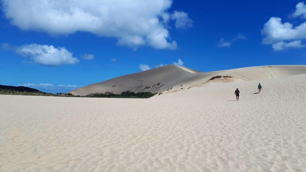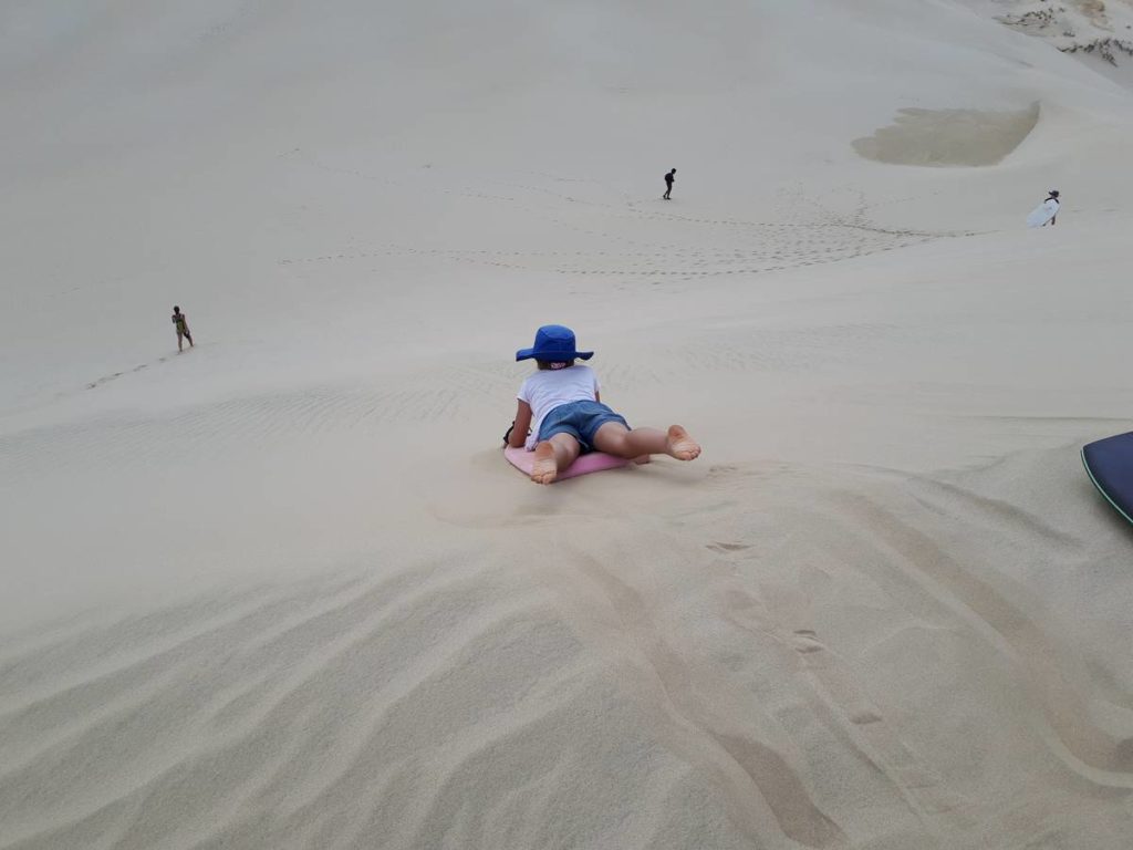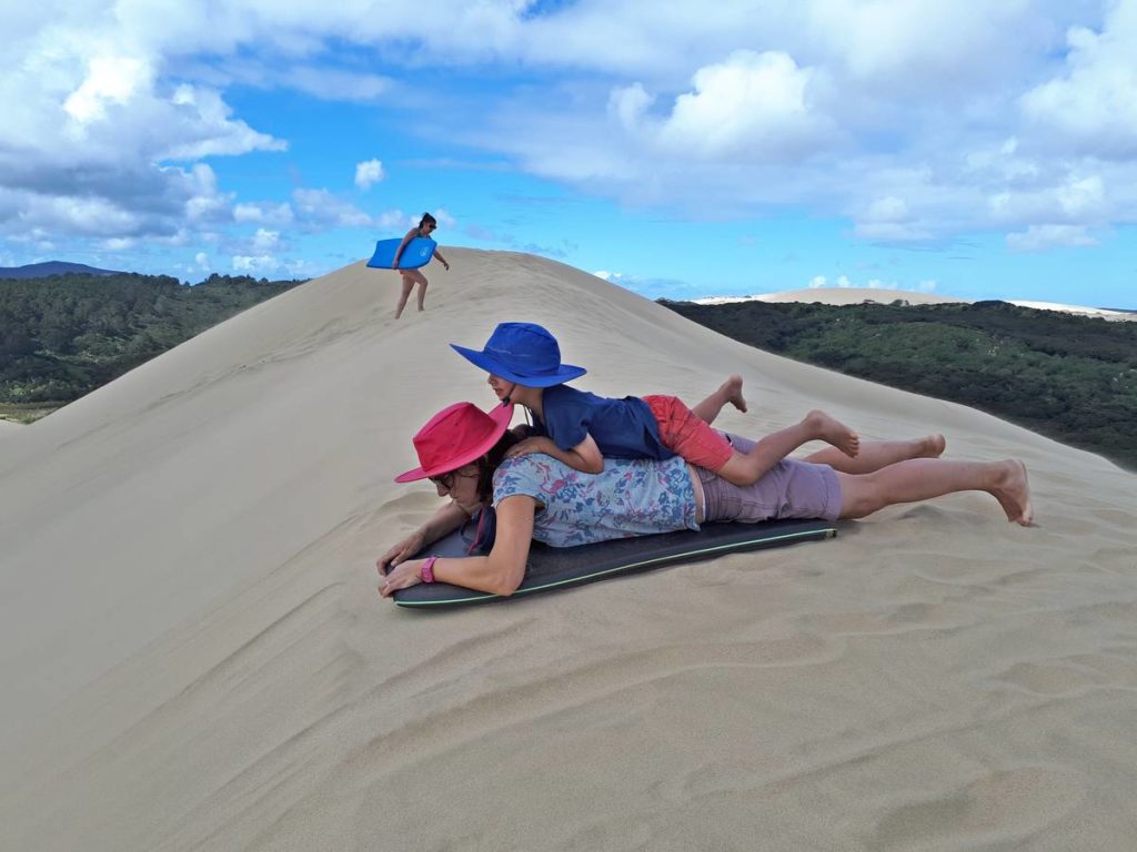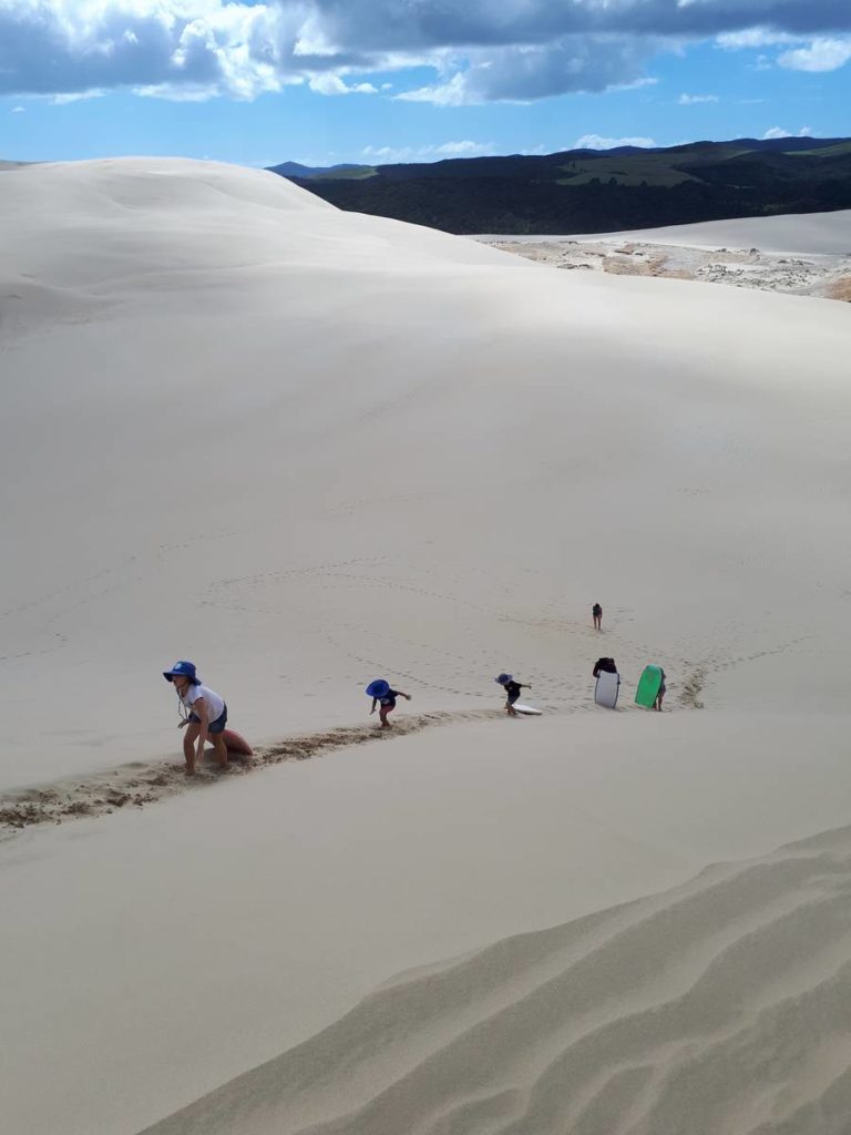 Après la nuit, mardi 19 mars, nous nous sommes baignés dans la mer puis avons pris la voiture pour nous rendre à l’extrémité nord de la ninety miles beach où se trouvent d’immenses dunes de sable. Nous avons loué des planches (sandy board) au pied des dunes afin de glisser sur celles-ci. Nous sommes montés en haut des dunes, la vue était splendide, surplombant la grande plage. Brieuc n’est pas descendu seul sur une planche, nous l’avons pris sur notre dos. Nous nous sommes bien amusés ! Nous avons beaucoup apprécié les descentes, un peu moins les montées ! A la fin on recrachait du sable par les yeux, le nez et les oreilles!
