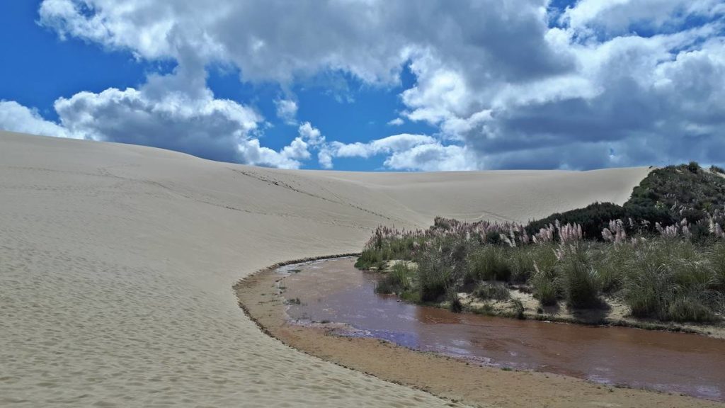 Ensuite nous avons repris la voiture et nous nous sommes dirigés vers l’extrême nord de l’île qui a la forme d’un doigt. Nous avons pris un petit ferry en voiture pour raccourcir le trajet, ce n’était pas prévu au départ mais notre GPS nous l’a proposé sans nous prévenir! Le trajet a duré une vingtaine de minutes de Rawene à Kohukohu. Puis nous sommes arrivés dans la péninsule étroite et avons longé en voiture l’immense plage de 96 kilomètres nommés « Ninety miles beach ». Nous avons choisi un camping pittoresque à Hukatere, perdu au milieu des dunes, avec une belle vue sur la mer. C’était très calme et la propriétaire était charmante. Elle nous a même proposé d’utiliser une cabine contenant des lits gratuitement. Clarence a choisi d’y dormir et a apprécié d’avoir un peu plus d’espace et d’être séparée de ses frères le temps de deux nuits!
