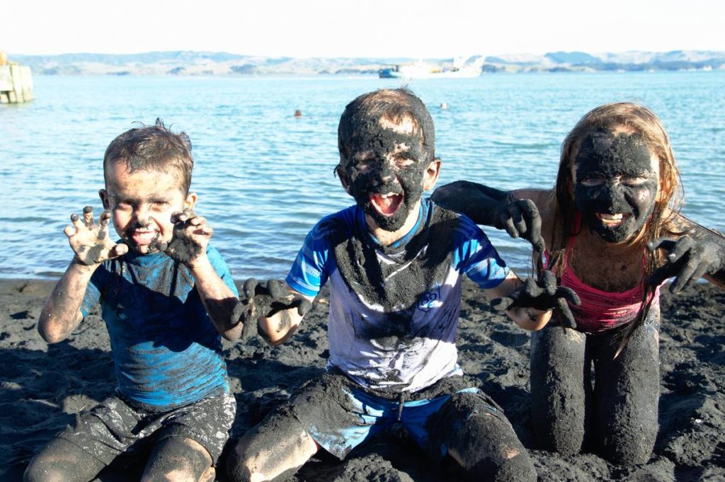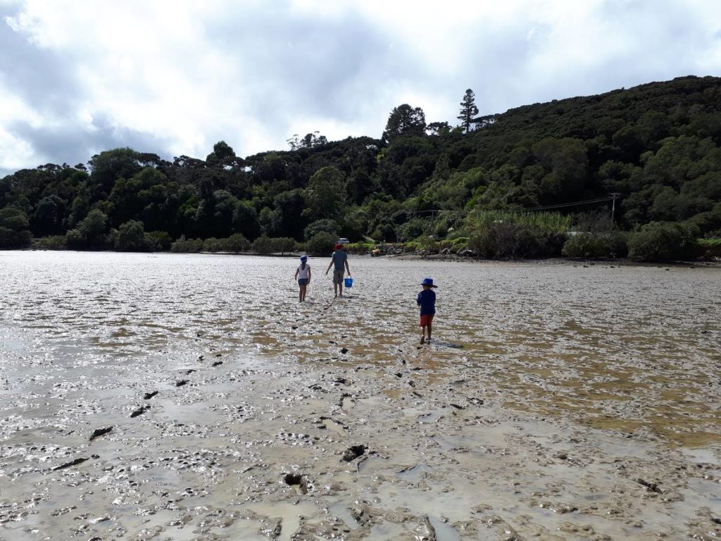Mercredi 20 mars, nous avons quitté la côte ouest du Northland et sommes redescendus par la côte est, bien plus découpée. Nous avons fait un premier arrêt à Waitangi, ville dans laquelle le traité de Waitangi entre les Maoris et les Britanniques avait été signé le 6 février 1840. Puis nous avons pêché de nombreuses et grosses coques à côté de Whangaroa dans une baie marécageuse. Nous étions bien boueux après la belle pêche, surtout Brieuc ! Ensuite, nous avons fait une pause baignade sur une belle plage à Wainui. Enfin, nous avons rejoint un camping particulier dans son genre car il se trouvait dans une réserve située sur la péninsule d’Ahora island où un couple de kiwis oiseaux est protégé et ces derniers peuvent être observés parfois la nuit dans la forêt. A peine arrivés au camping, sous la pluie cette fois-ci, il a fallu s’activer pour s’installer et être prêts à la tombée de la nuit pour aller essayer d’observer les kiwis. Les enfants étaient très excités ! Nous sommes partis à la recherche des kiwis, munis de lampes rouges pour ne pas les effrayer. Nous les avons entendus distinctement mais seul François-Yves a pu en apercevoir un de loin. La pluie nous a gênés car le bruit des gouttes nous empêchait d’entendre les kiwis gratter à la recherche de nourriture,et donc de les localiser.