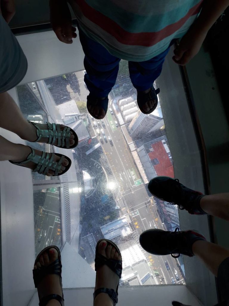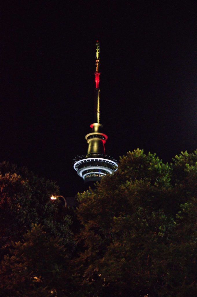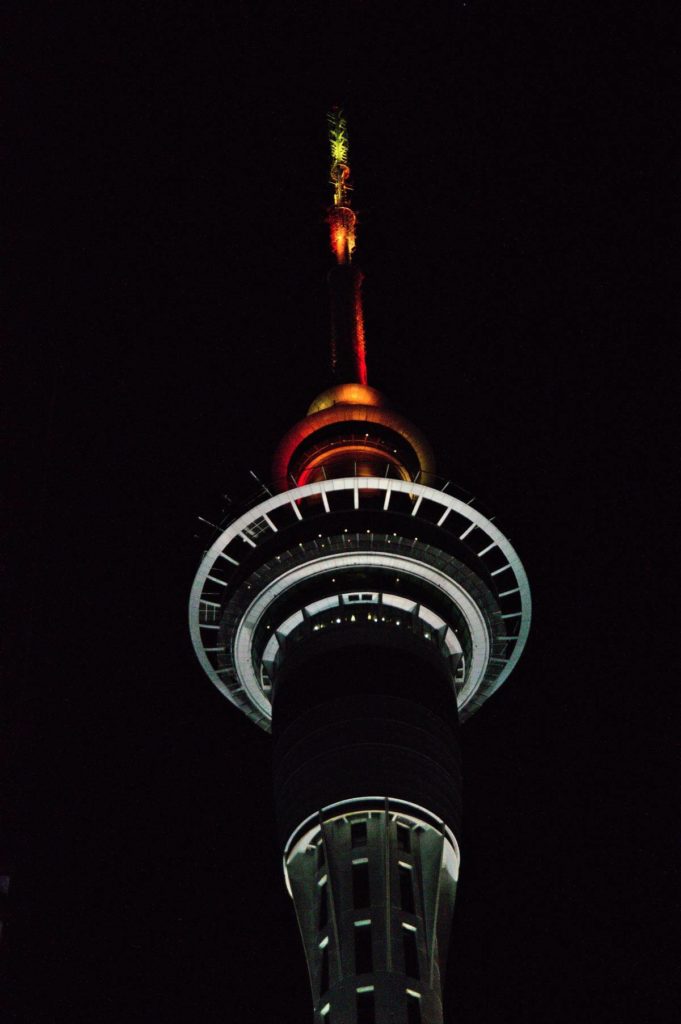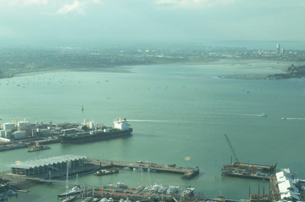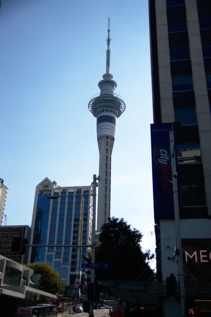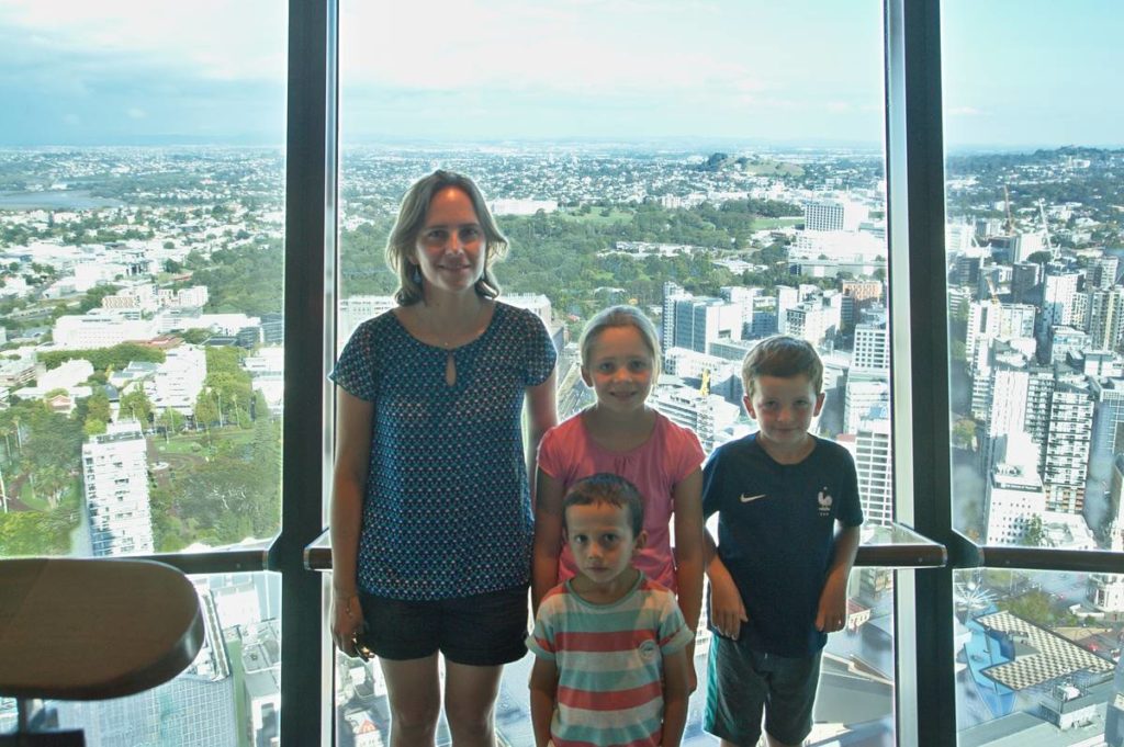Nous sommes arrivés en fin de matinée à notre lieu d’hébergement d’Auckland. Nous avons profité de l’après-midi et de la soirée pour visiter la ville. Notre objectif principal, si ce n’est le seul, était de voir de près cette fameuse tour d’Auckland. Nous l’avions promis aux enfants. Léon avait étudié la question depuis plusieurs semaines et avait motivé les troupes! Cette tour en béton a été construite en 1997 et sert avant tout à la transmission de la télévision et de la radio dans la région d’Auckland. Elle mesure 328 mètres, soit 4 mètres de plus que la tour Eiffel. Nous nous sommes payé le luxe de monter en haut de la tour d’où on a une vue imprenable sur la ville et sa baie. On pouvait aussi marcher sur une vitre au sol et voir les passants en contrebas. Vertigineux! Sur un écran, on pouvait aussi observer des personnes se préparant à sauter à l’élastique depuis le haut de la tour.