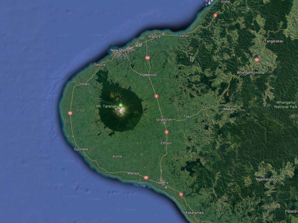 Nous avons quitté Wellington mercredi 13 mars dans la matinée et avons longé la côté ouest de l’île du Sud pour rejoindre la ville de New Plymouth après environ 4h30 de route. A côté de cette ville, à une trentaine de kilomètres, se trouve un grand volcan appelé le mont Taranaki ou mont Egmont qui domine la région du haut de ses 2518 mètres. Malheureusement le mauvais temps ne nous a pas permis de l’apercevoir. Ce volcan marque le profil de la côte Sud Ouest de l’Ile du Nord et se voit très bien sur la carte, car au 19ème siècle, un cartographe a tracé les limites du parc national du volcan au compas. A l’intérieur du cercle: la forêt pluviale. A l’extérieur, les terres ont été transformées en champs et pâturages.