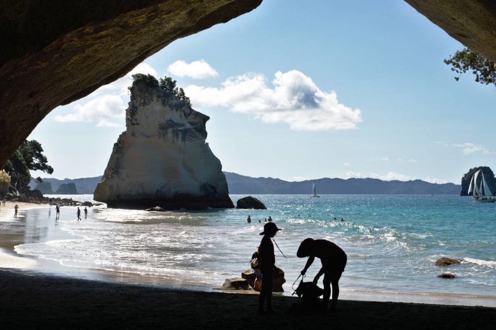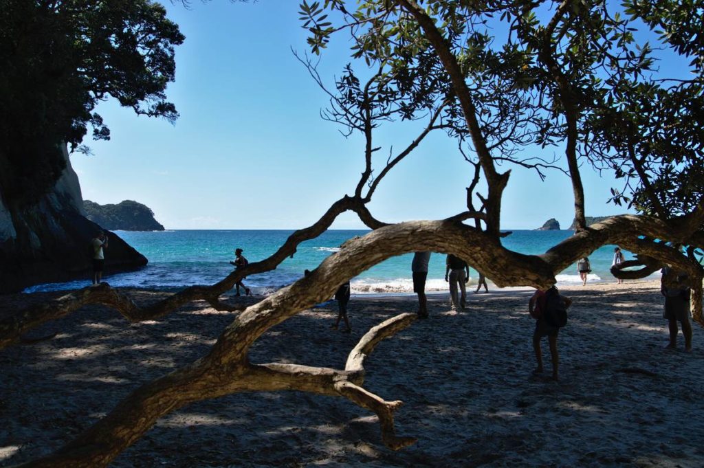 Le lendemain nous sommes partis à la découverte des attractions de la côte est. Nous avons commencé par aller voir les fameuses falaises « Cathedral Cove » dans lesquelles se découpent une arche et des grottes. Pour y accéder il faut se garer sur un grand parking assez éloigné, prendre une navette et marcher trois quarts d’heure. Mais la beauté du lieu justifie ces efforts, même si nous n’étions pas les seuls à avoir eu cette excellente idée. Après le repas sur la plage, nous sommes repartis puis avons continué notre route vers l’attraction suivante: les bains chauds de Hot Water Beach. Comme à Kawhia, il s’agit de remontées d’eau chaude d’origine volcanique et il suffit de creuser un trou dans le sable pour en profiter. Mais ici les sources sont plus puissantes, ce qui fait qu’on peut réellement creuser un gros trou et avoir suffisamment d’eau chaude pour se baigner. Il faut quand même faire attention à ne pas se brûler; l’eau peut dépasser 60°C ! Nous y avons passé un bon moment.